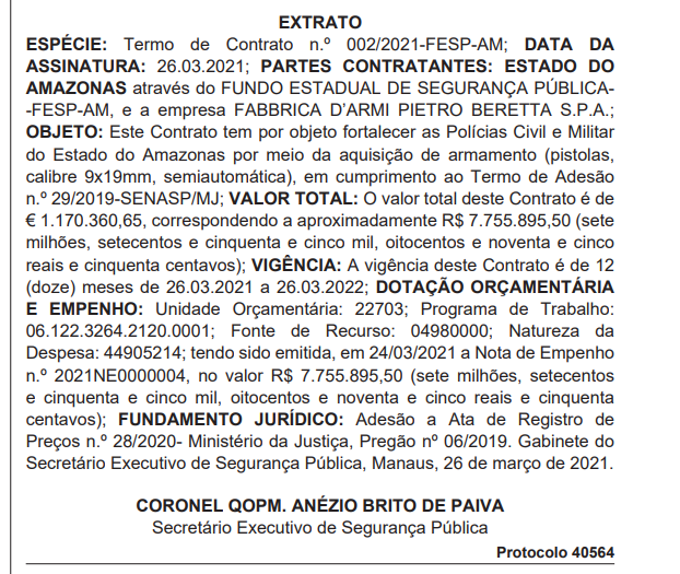 Os contratos são destinados à compra de sete mil pistolas semiautomáticas. Um deles, o contrato n.º 002/2021-FESP-AM, teve o extrato publicando do Diário Oficial do Estado (DOE), no último dia 9/4, e é referente a compra de 3.800 armas.