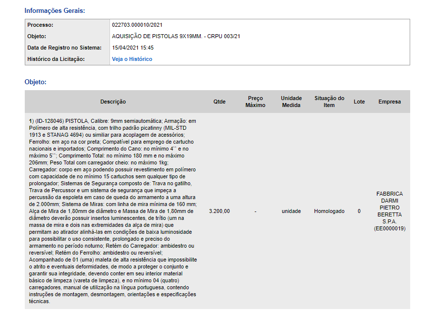 As informações referentes a aquisição de outras 3.200 armas estão descritas no processo de homologação CRPU 003/21. A publicação, presente no Portal da Transparência não especifica o valor individual de cada arma, mas, segundo o documento, o valor total do contrato é de R$ 6.421.440,00 (seis milhões, quatrocentos e vinte e um mil, quatrocentos e quarenta reais).