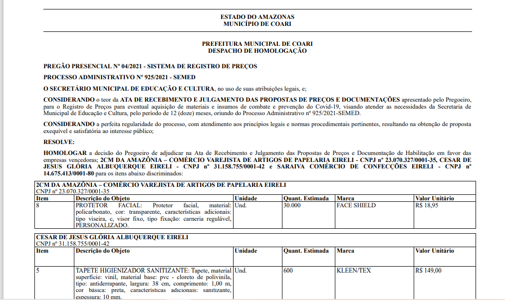 Início de 2020 – No início de 2020, quando Adail Filho ainda era Prefeito de Coari, a prefeitura municipal também efetuou a compra, por meio de licitação, dos mesmos produtos e gastou quase R$ 3 milhões (R$2.899.757,67) para fazer o pagamento das empresas Lira Comércio de Produtos Alimentícios Eireli, Nasser Indústria e Comércio de Confecções Eireli, Plutão da Amazônia Ltda e Sally Sthefany Marques Andrade, vencedoras da licitação na época.