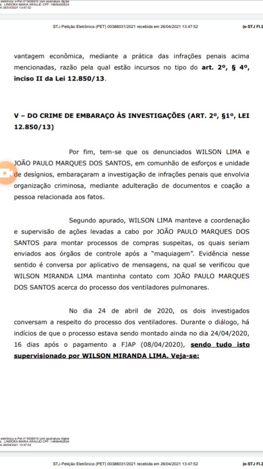 Ainda de acordo com a subprocuradora, “fica evidente, portanto, o intuito do denunciado João Paulo Marques, sob a coordenação e supervisão do Governador, o denunciado Wilson Lima, de embaraçarem as investigações de infração penal que envolve organização criminosa, notadamente a aquisição superfaturada de respiradores pela FJAP E CIA, assim como processos sobre contratações no Hospital Nilton Lins”.