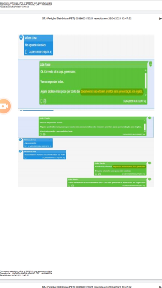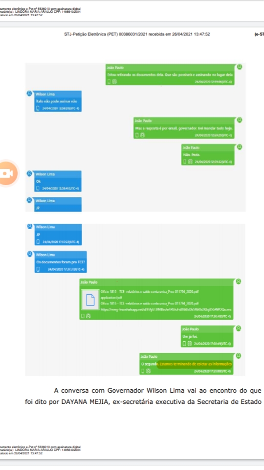 Por volta de 17h, Lima volta a perguntar de João Paulo Marques se os documentos foram enviados ao TCE. O secretário informa que um dos documentos já foi enviado e o outro não: “Estamos terminando de coletar as informações”. Para a PGR, o teor da conversa vai ao encontro do depoimento de Dayana Mejia na Polícia Federal.