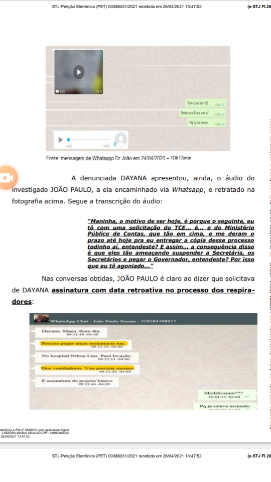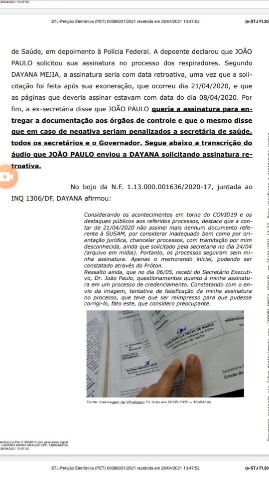 A ex-secretária disse que João Paulo solicitou a assinatura dela no processo dos respiradores, mas com data retroativa, uma vez que a solicitação dos órgãos de controle foi feita após a exoneração dela, que ocorreu no dia 21 de abril. Segundo ela, as páginas que deveriam ser assinadas estavam com data do dia 8 de abril.