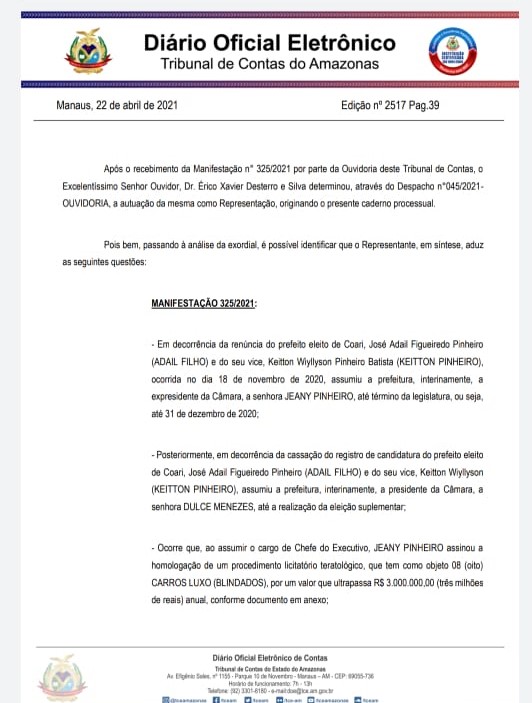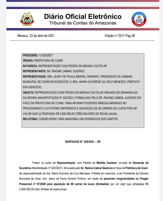 O Tribunal de Contas do Estado (TCE) vai apurar possíveis irregularidades no procedimento licitatório feito pela Prefeitura de Coari para a aquisição de oito carros de luxo. Quatro deles blindados com o valor superior a R$ 3 milhões. A atual prefeita em exercício do município, Dulce Menezes (MDB) e a prefeita em exercício à época da licitação, Jeany Pinheiro (PP) vão precisar dar explicações ao Tribunal de Contas sobre o contrato.
