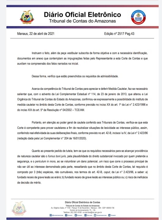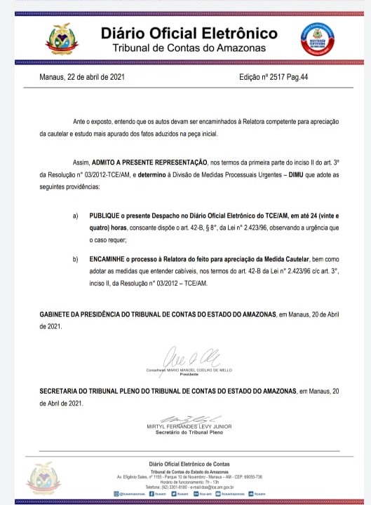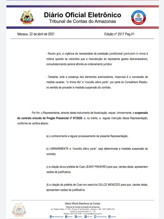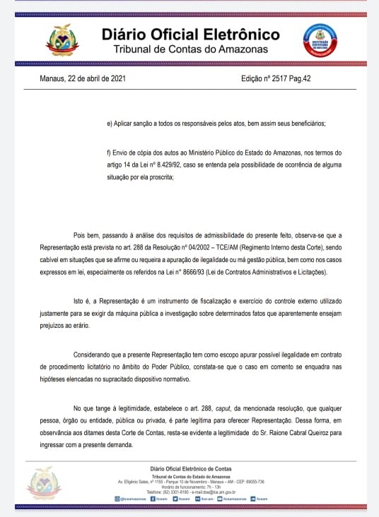 Na representação, a prefeitura é acusada de favorecer empresários do ramo que “sempre” ganham os processos licitatórios na cidade. Além disso, caso seja confirmada a irregularidade, o denunciante pede a “suspensão do contrato oriundo do Pregão Presencial nº 97/2020” e que se “aplique sanção a todos os responsáveis pelos atos”, além do “envio de cópia dos autos ao Ministério Público do Estado do Amazonas nos termos do artigo 14 da Lei nº 8.429/92, caso se entenda pela possibilidade de ocorrência de alguma situação por ela proscrita”.