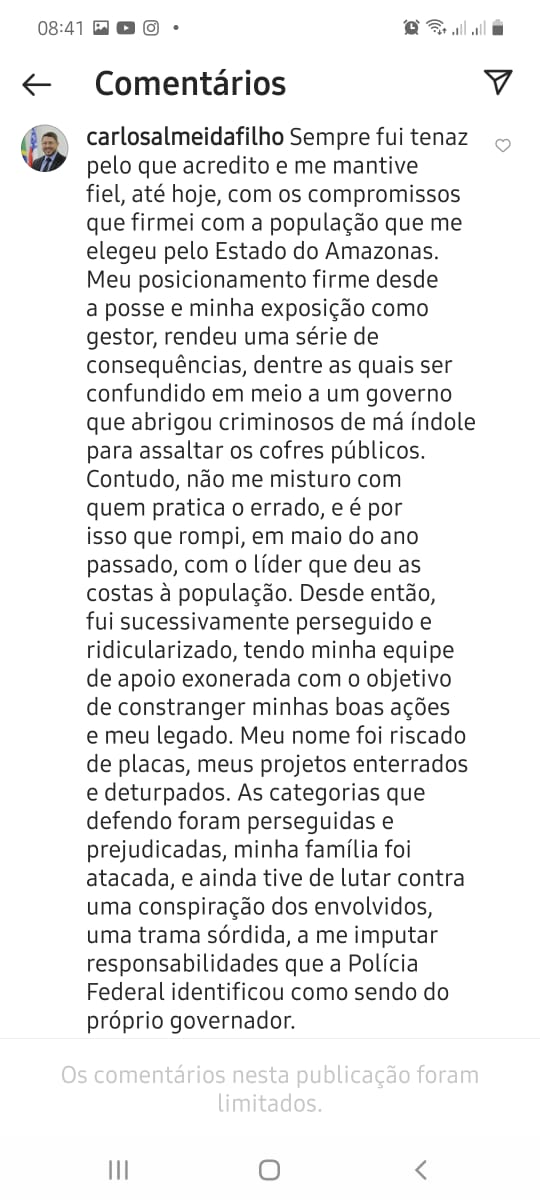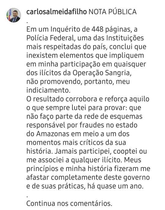 Afastamento – Almeida diz ainda não ter feito parte da rede de esquemas responsável por fraudes no Estado do Amazonas. “Jamais participei, cooptei ou me associei a qualquer ilícito. Me recuso a fazer parte de uma quadrilha que só faz prejudicar o povo amazonense e o Brasil”, completou ele afirmando terem sidos esses os motivos de seu afastamento do governo Wilson Lima há quase um ano.