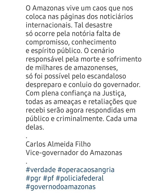 O vice-governador do Amazonas, Carlos Almeida (PTB) se manifestou pelas redes sociais afirmado que não existem provas de seu envolvimento nos crimes, que vem sofrendo ameaças e chamou o governador Wilson Lima (PSC) de despreparado