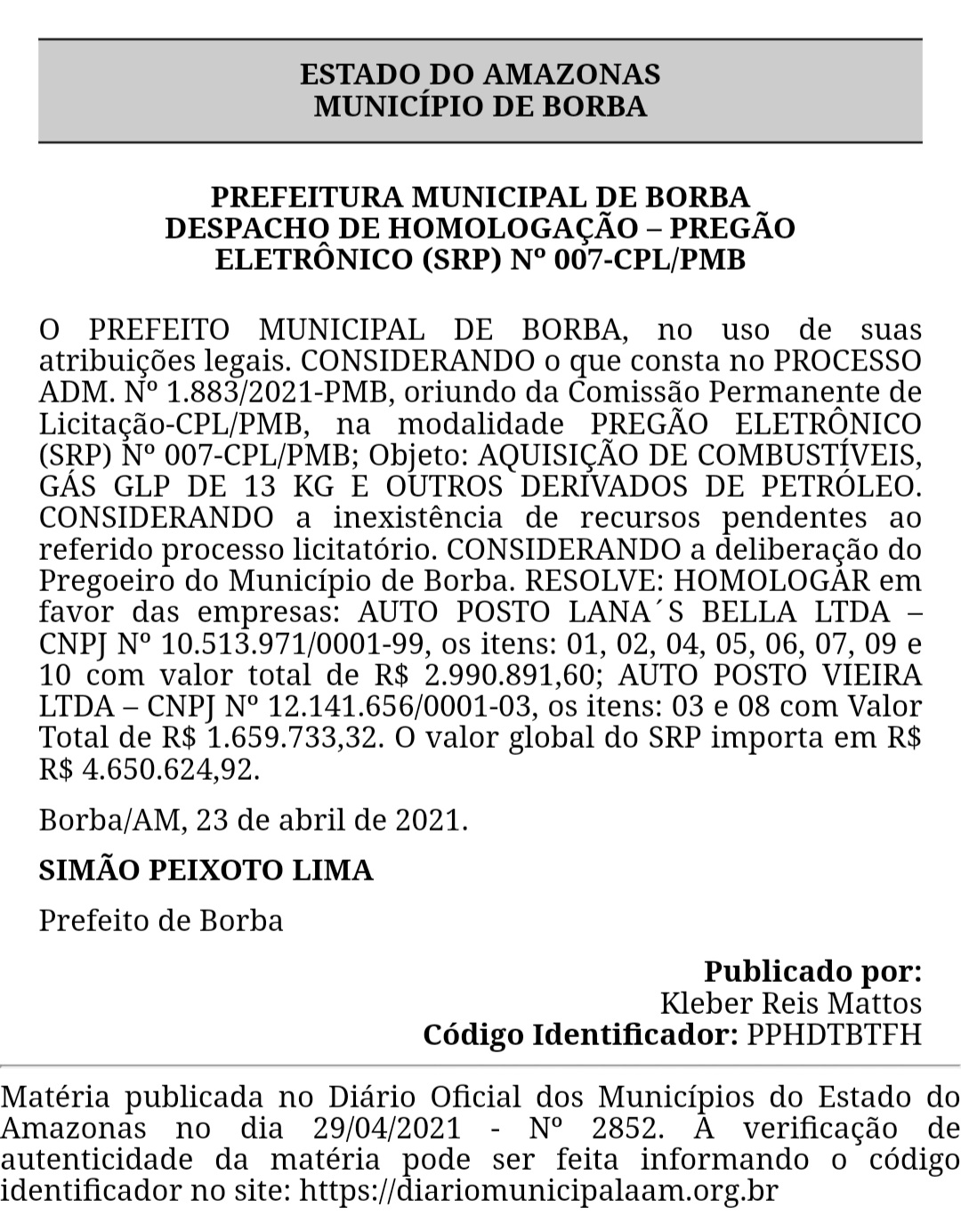 Conforme publicação no Diário Oficial da Associação Amazonense dos Municípios (AAM), as empresas Auto Posto Lana’s Bella Ltda e Auto Posto Vieira Ltda, com as sedes em Borba, foram as vencedoras do pregão nº 007 – CPL/PMB.