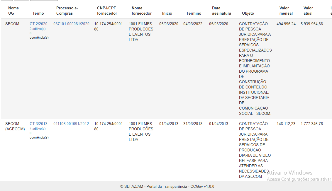 O contrato – De acordo com o Portal da Transparência do Governo do Amazonas, o convênio firmado com a 1001 Filmes Produções e Eventos Ltda tem valor global de R$ 5.939.954,88. A transação entrou em vigor em março de 2020 e tem previsão de término em março de 2022. O valor do contrato excede em 347% o valor gasto com a mesma empresa na gestão anterior a de Wilson Lima.