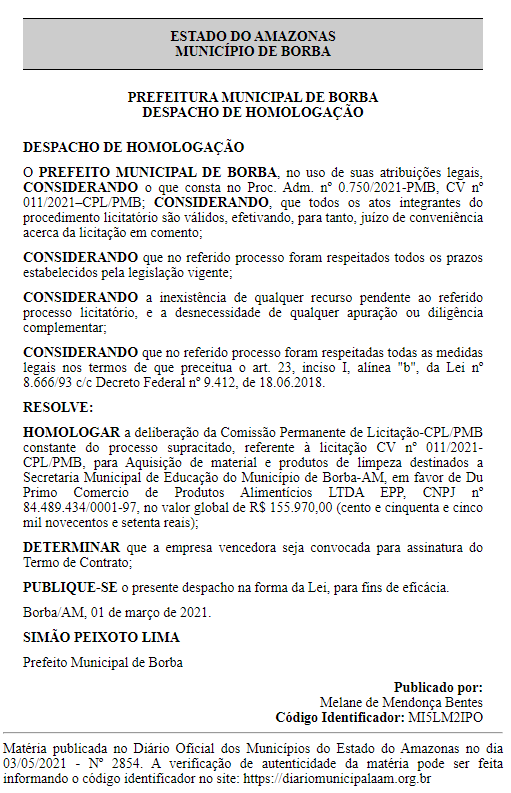 De acordo com a homologação do pregão presencial nº 006 – CPL/PMB, publicado no Diário Oficial da Associação Amazonense dos Municípios (AAM), a RN Albuquerque Brasil Eireli irá receber da Prefeitura de Borba o valor de R$ 560.910,00.
