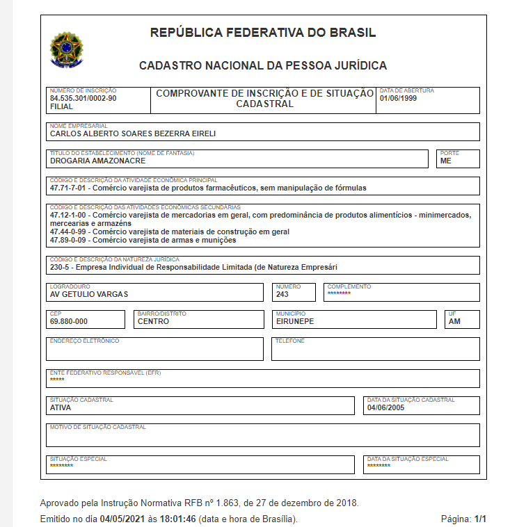 Um contrato de mais de R$ 1,5 milhão foi firmando entre a Prefeitura de Eirunepé (a 1.160 quilômetros de Manaus) e uma drogaria para a aquisição de material de construção. A empresa Carlos Alberto Soares Bezerra EIRELI – ME, vencedora da licitação, tem como nome fantasia Drogaria Amazonacre, tendo como atividade principal o comércio varejista de produtos farmacêuticos.