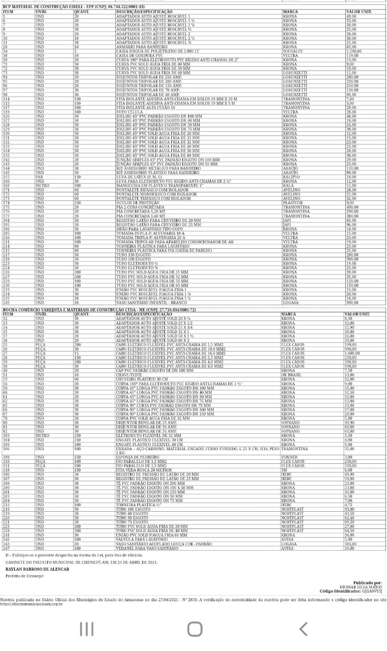 Outros contratos – A mesma empresa também tem o nome em outras três licitações feitas somente em 2021. As licitações são referentes a compra de material de construção, elétricos e hidráulicos. Nos demais contratos, ela divide o fornecimento de produtos relacionados a construção civil com outras duas empresas. Em um deles, só a Carlos Alberto Soares Bezerra EIRELI, vai receber da Prefeitura de Eirunepé mais de R$ 310 mil.