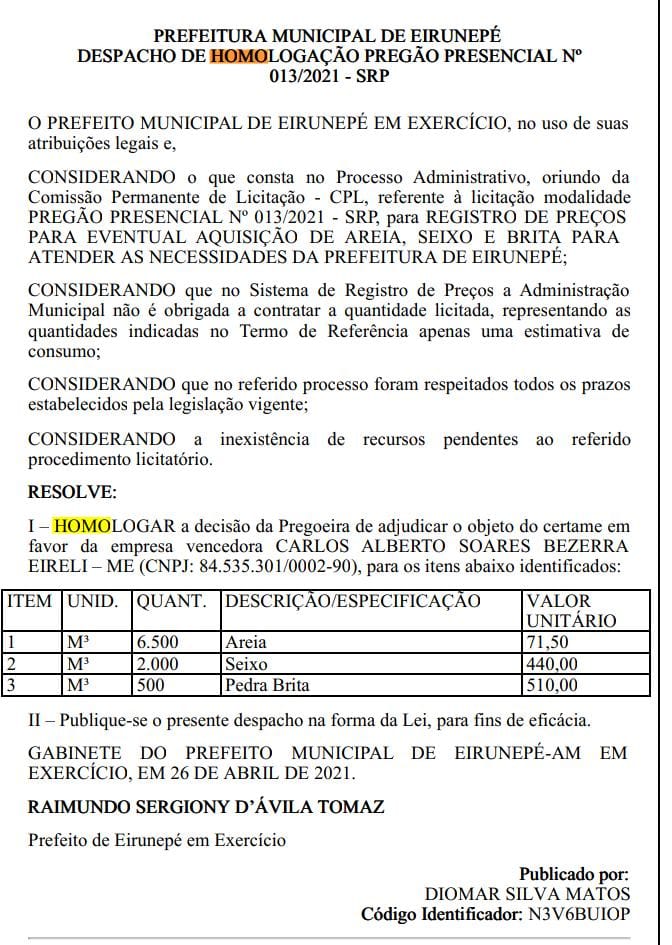 No documento consta apenas que “a aquisição de areia, seixo e brita são para atender as necessidades da prefeitura de Eirunepé”. O total das compras será de R$ 1.599.750,00 e o pagamento deverá ser efetuado no período de um ano.