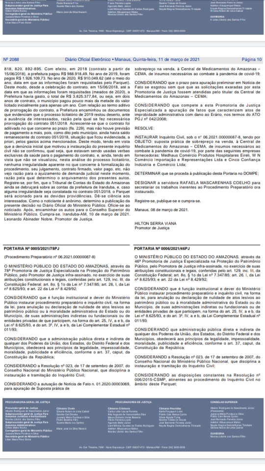 Licitação – Iranduba firmou contrato com cinco empresas para o “fornecimento de medicamentos de controle especial e da atenção básica”, com valores que ultrapassam R$ 5,2 milhões. Uma das empresas, a WN Comercio Importação e Representações Ltda foi alvo de inquérito, em março deste ano, do Ministério Público do Estado do Amazonas (MPE-AM) para “apurar suposta prática de sobrepreço na venda à Central de Medicamentos do Amazonas (Cema) de insumos necessários ao combate à pandemia de Covid-19”.