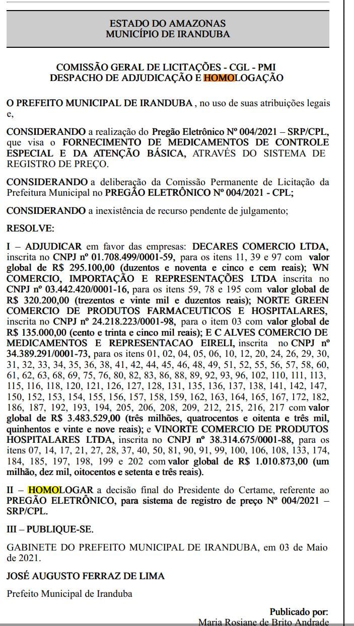 De acordo com a homologação do pregão eletrônico nº 004/2021 – SRP/CPL, publicado no Diário Oficial da Associação Amazonense dos Municípios (AAM), a Prefeitura de Iranduba firmou contrato com as cinco empresas no valor total de R$ 5.244.702,00. O documento foi assinado pelo prefeito em exercício José Augusto Ferraz de Lima.