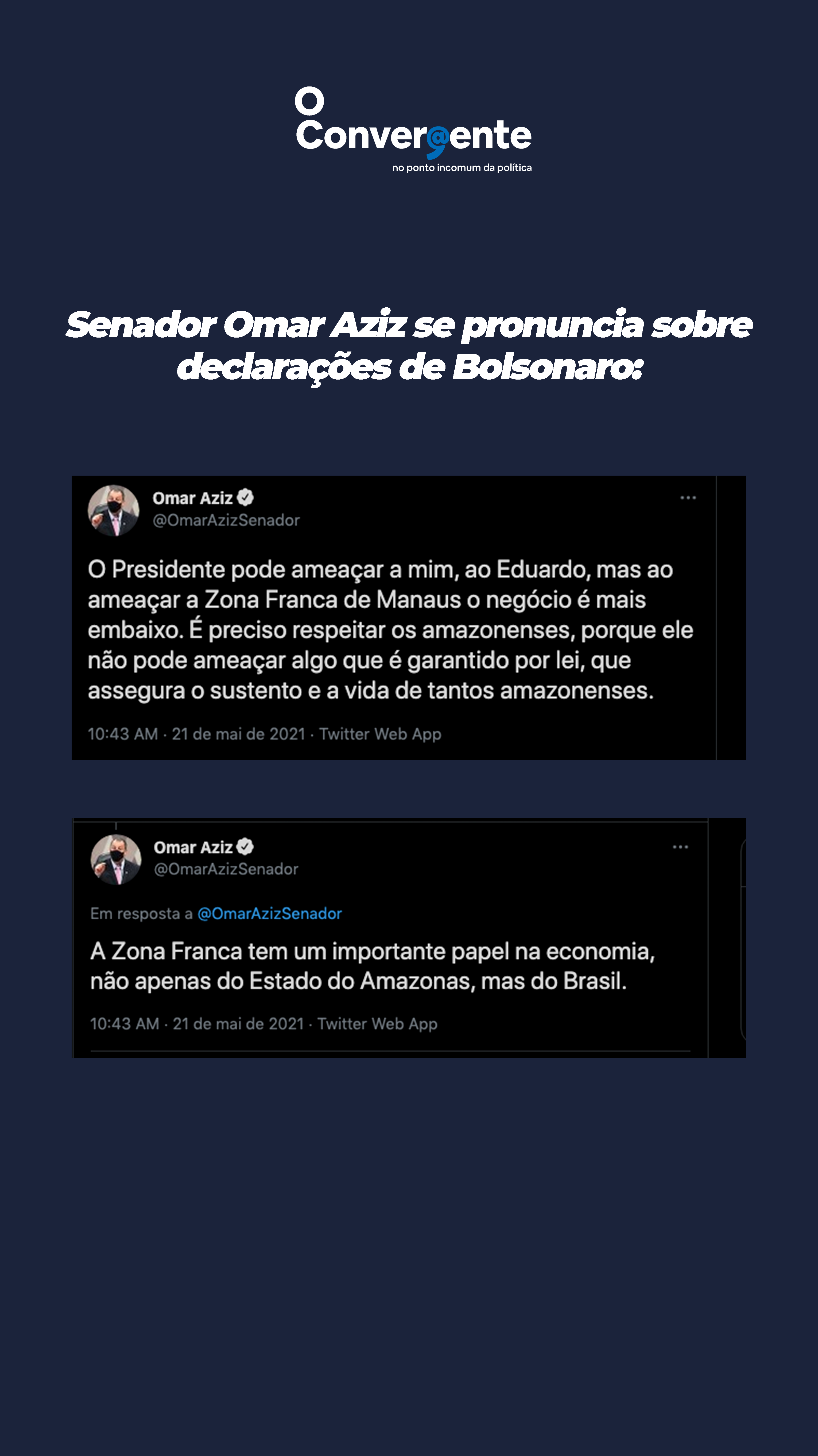 O senador Omar Aziz (PSD), presidente da CPI da Covid, se pronunciou pelo Twitter sobre as declarações em tom de ameaça feitas pelo presidente Jair Bolsonaro ao modelo Zona Franca de Manaus (ZFM).