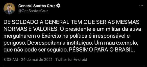 No Twitter, quem também reagiu à participação de Pazuello no ato foi o general Carlos Alberto dos Santos Cruz, ex-ministro da Secretaria de Governo de Bolsonaro. “De soldado a general tem que ser as mesmas normas e valores. O presidente e um militar da ativa mergulharem o Exército na política é irresponsável e perigoso. Desrespeitam a instituição. Um mau exemplo, que não pode ser seguido. Péssimo para o Brasil”.