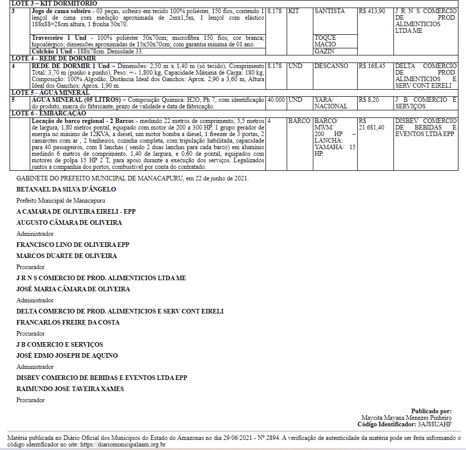 Empresas – Também foram as vencedoras do pregão presencial nº 015/2021, além da J B Comércio e Serviços, os estabelecimentos: Disbev Comércio de Bebidas e Eventos Ltda EPP; J R N S Comércio de Prod. Alimentícios Ltda ME, nome fantasia Supermercado Bastos; Delta Comércio de Prod. Alimentícios e Serv Cont Eireli, nome fantasia Delta Comércio; A Câmara de Oliveira Eireli EPP e Francisco Lino de Oliveira EPP, nome fantasia Supermercados Joia e Lino Empreendimentos.