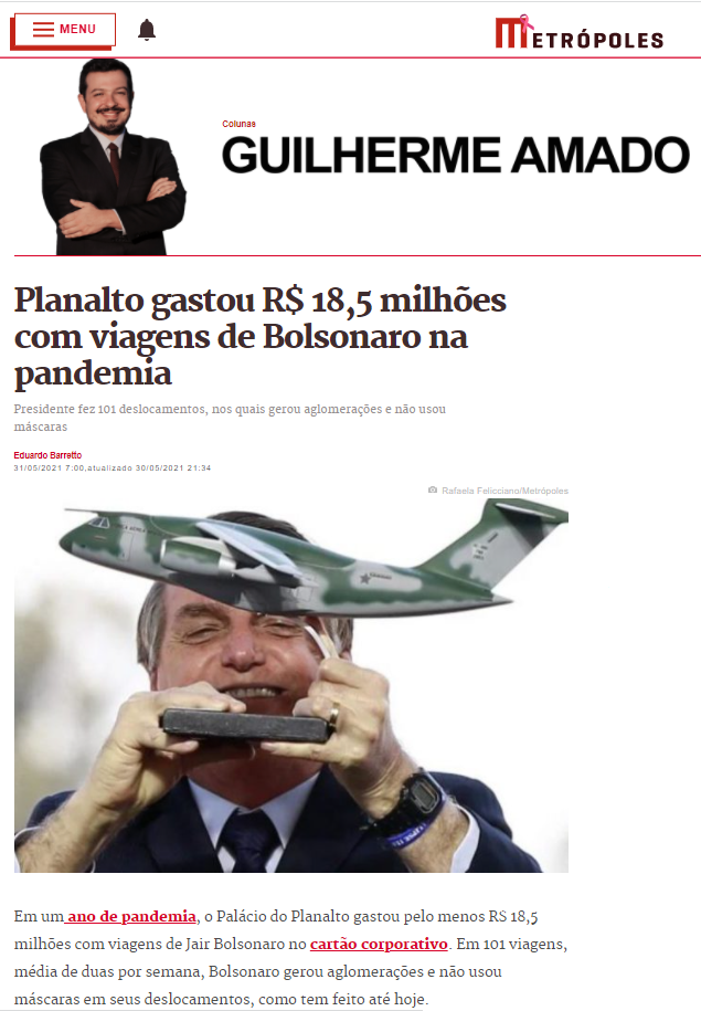 No período de março de 2020 a março de 2021, o Palácio do Planalto gastou, ao menos, R$ 18,5 milhões em viagens do presidente Jair Bolsonaro durante a pandemia da Covid-19. Conforme informações da coluna de Guilherme Amado no Metrópole, obtidas via Lei de Acesso à Informação, o presidente realizou ao todo 101 viagens, uma média de duas por semana.