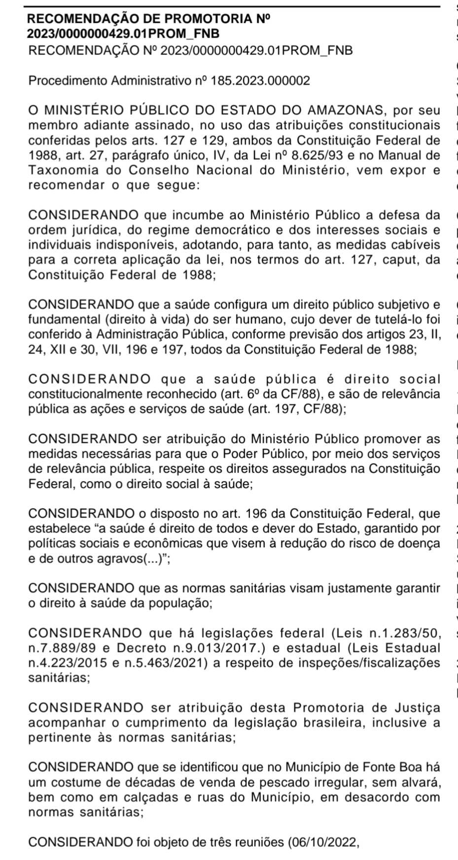 O Ministério Público do Amazonas (MPAM) fez recomendações à Prefeitura de Fonte Boa, comandada por Gilberto Ferreira Lisboa (PL), o “Biquinho”, e para Vigilância Sanitária do município pela prática de venda de pescado de irregular, sem alvará e em calçadas e ruas do município, em desacordo com as normas sanitárias.