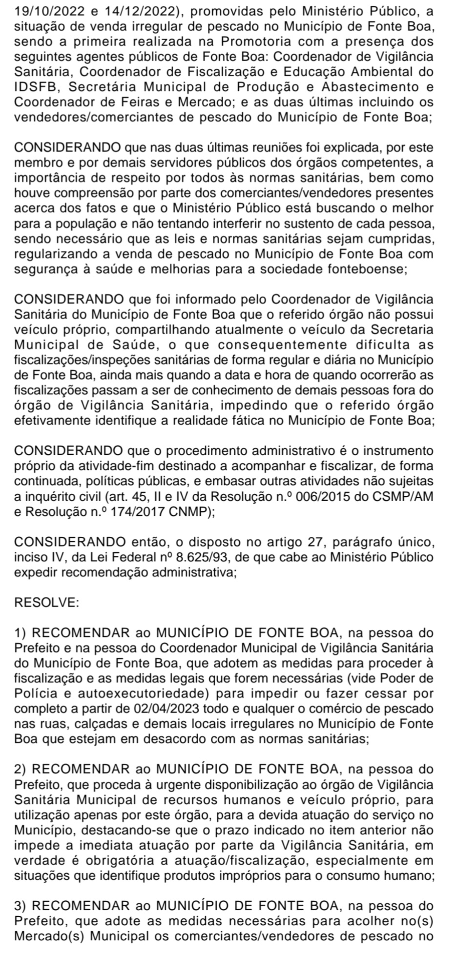 No documento, publicado no Diário Oficial do órgão, na edição dessa quarta-feira, 4/1, o promotor de Justiça Ricardo Mitoso Nogueira Borges, destaca que já tinham sido feitas três reuniões, para tratar do assunto, com a presença de representantes da Vigilância Sanitária, Fiscalização e Educação Ambiental, da Secretaria Municipal de Produção e abastecimento, e de Feiras e Mercados de Fonte Boa.