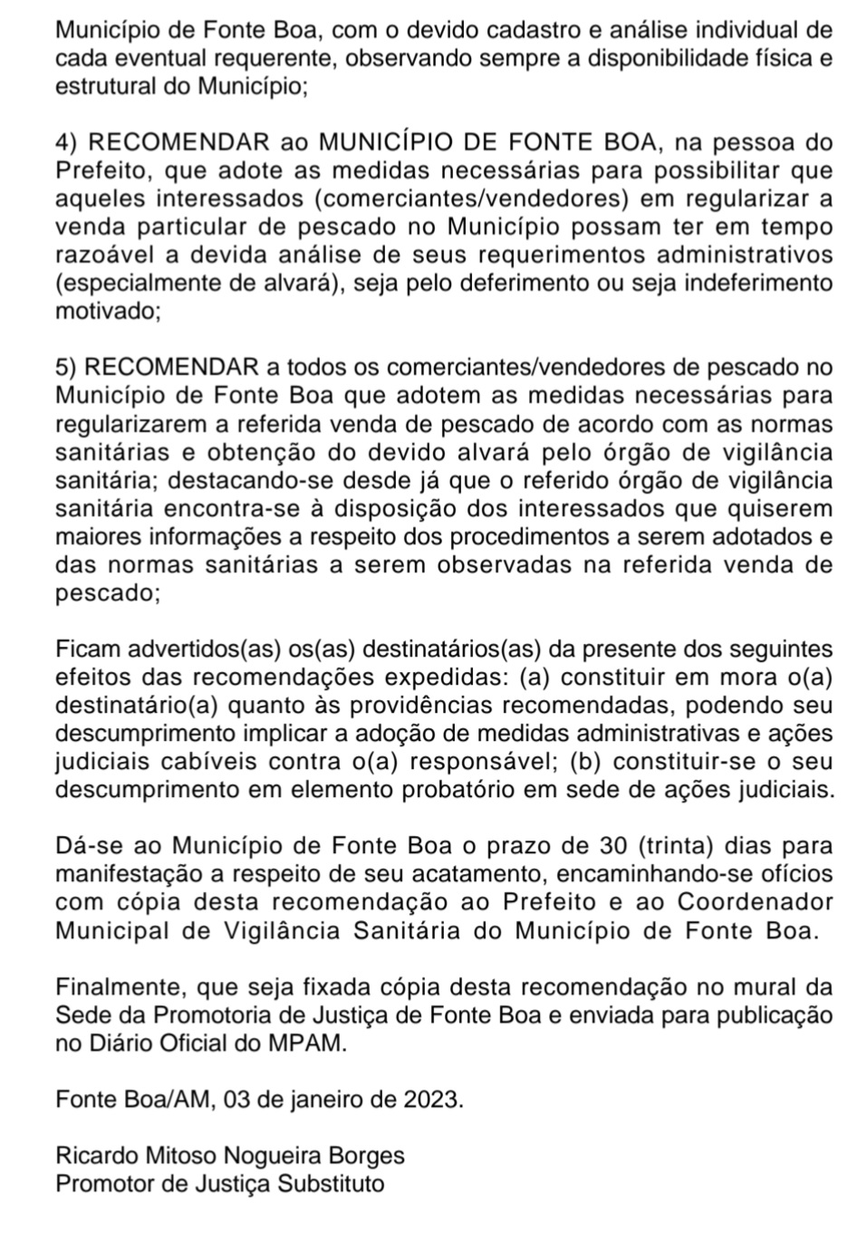 Além disso, o promotor ainda recomendou a todos os comerciantes/vendedores de pescado de Fonte Boa que adotem as medidas necessárias para regularizarem a referida venda de pescado de acordo com as normas sanitárias e obtenção do devido alvará pelo órgão de vigilância sanitária.