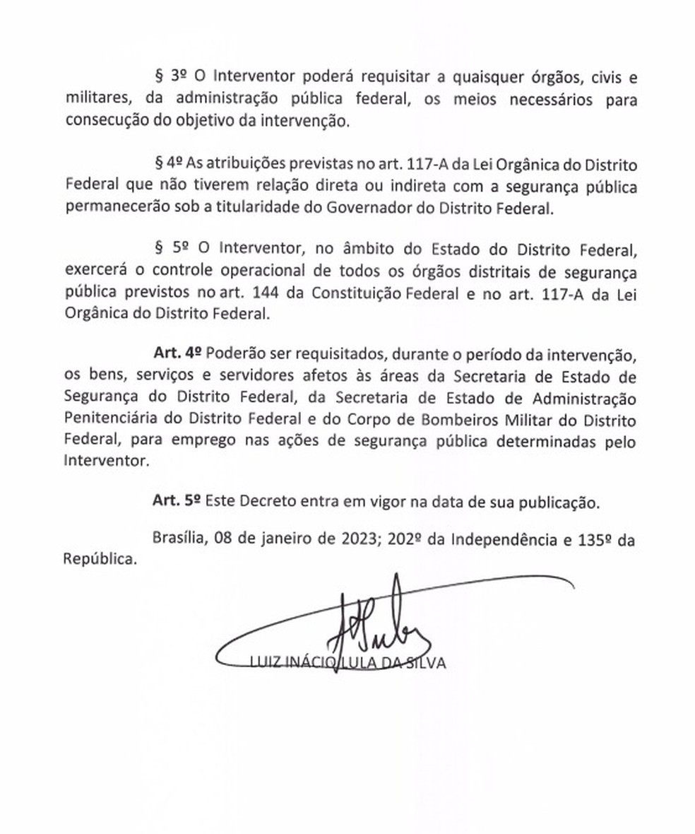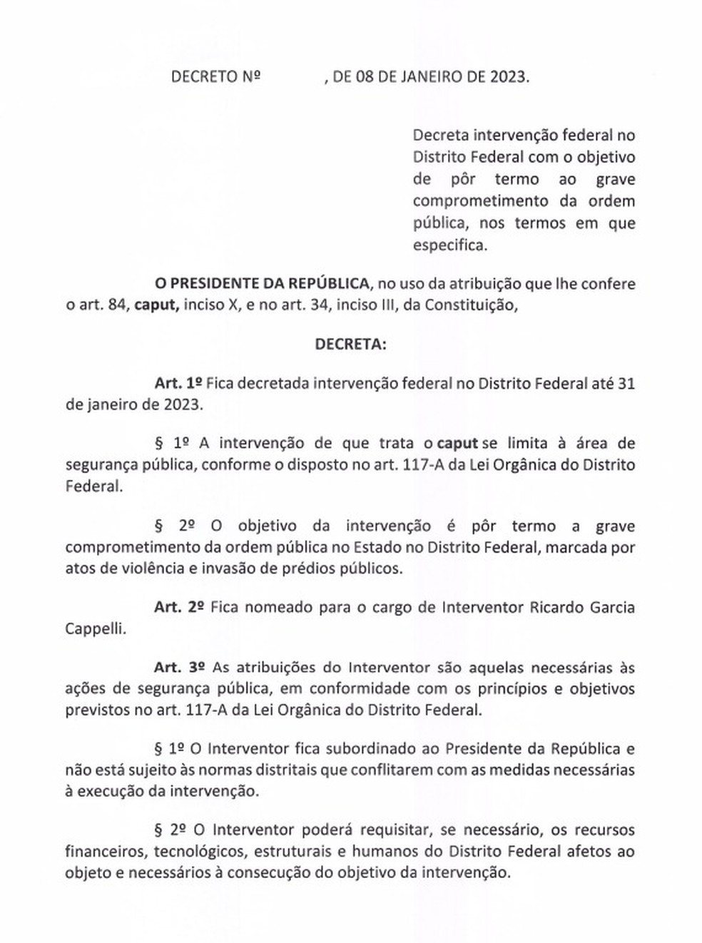 O presidente da República Luís Inácio Lula da Silva (PT) anunciou ainda pouco, neste domingo, 8/1, um decreto de intervenção federal na área de segurança pública do Distrito Federal para manter a ordem pública após a invasão de bolsonaristas radicais aos prédios do Congresso Nacional, Palácio do Planalto e Supremo Tribunal Federal (STF).