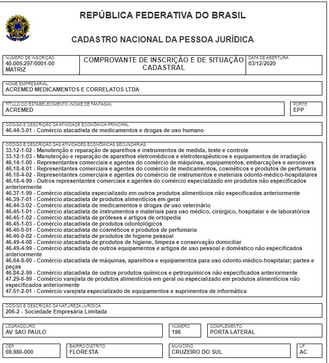 De acordo com as informações do site da Receita Federal, a empresa licitada Acremed Medicamentos e Correlatos Ltda, está inscrita no CNPJ 40.005.297/0001-00, com o nome fantasia de Acremed, sendo a sua principal atividade econômica o Comércio Atacadista de Medicamentos e Drogas de Uso Humano, o qual informa ainda, que a empresa é de Pequeno porte (PP).