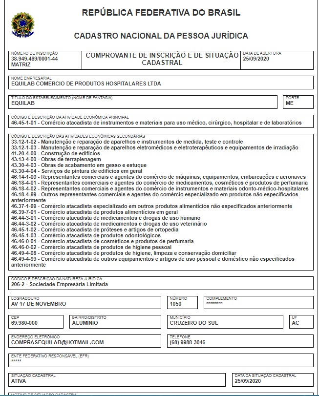 De acordo com as informações do site da Receita Federal, a empresa licitada Equilab Comercio de Produtos Hospitalares Ltda, está inscrita no CNPJ 38.949.469/0001-44, com o nome fantasia Equilab, a sua principal atividade econômica é o Comércio Atacadista de Instrumentos e Materiais Para Uso Médico, Cirúrgico, Hospitalar e de Laboratórios.