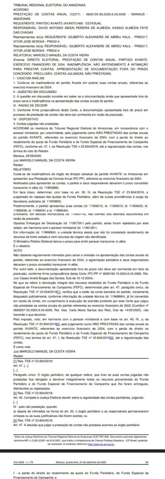 O Tribunal Regional Eleitoral do Amazonas (TRE-AM) suspendeu os repasses do Fundo Partidário e do Fundo Especial de Financiamento de Campanha (FEFC) ao partido Avante no estado, após julgar como não prestadas as contas anuais referentes ao exercício financeiro de 2024. A decisão teve relatoria do juiz Marcelo Manuel da Costa Vieira.