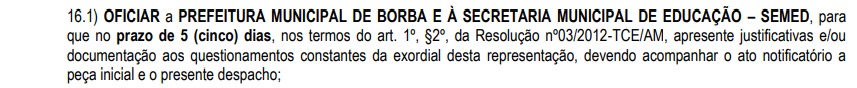 O Tribunal de Contas do Estado do Amazonas (TCE-AM) concedeu prazo de cinco dias para que o prefeito de Borba, Raimundo Santana de Freitas, o Toco Santana (Republicanos), e o secretário municipal de Educação, Paulo Antônio de Paula da Cruz, apresentem explicações sobre supostas irregularidades no uso de recursos do Programa Nacional de Alimentação Escolar (PNAE).