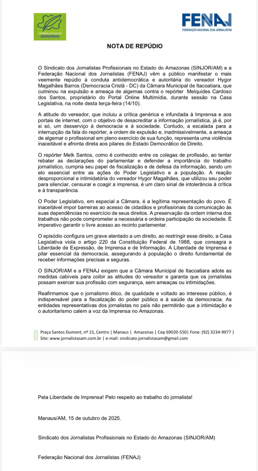 O Sindicato dos Jornalistas Profissionais no Estado do Amazonas (Sinjor-AM) e a Federação Nacional dos Jornalistas (Fenaj) divulgaram, nesta quarta-feira, 15, uma nota de repúdio contra o vereador Hygor Magalhães Barros (Democracia Cristã), da Câmara Municipal de Itacoatiara, após o parlamentar mandar retirar e ameaçar algemar o repórter Melk Santos, do Portal Online Multimídia, durante uma sessão legislativa na noite de terça-feira, 14.
