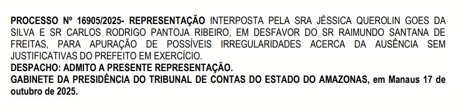 A representação ainda aponta que, durante o período de ausência do prefeito, a Prefeitura de Borba ficou sob o comando do vice-prefeito Toinho Cidade. No entanto, não houve comunicação oficial encaminhada para que a Câmara pudesse transferir as funções de prefeito ao vice.