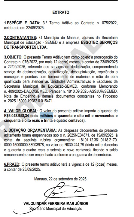 A Prefeitura de Manaus prorrogou por mais 12 meses o contrato nº 75/2022, firmado entre a Secretaria Municipal de Educação (Semed) e a empresa Esgotec Serviços de Transportes Ltda – EPP, responsável pela dedetização das unidades escolares e administrativas da rede municipal. O terceiro termo aditivo, publicado no dia 21 de outubro, acrescenta R$ 6.048.000,00 (seis milhões e quarenta e oito mil reais) ao valor do acordo.