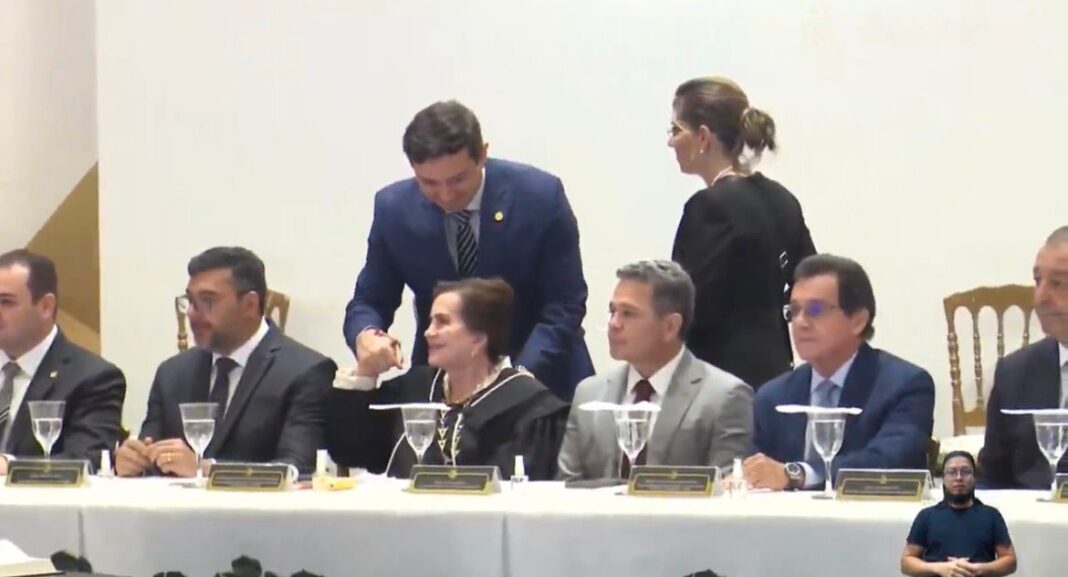 A solenidade também foi o momento de articulações políticas. Na mesa central onde estavam Yara Lins e demais conselheiros, também estiveram o governador Wilson Lima e Tadeu de Souza, lado a lado da presidente.