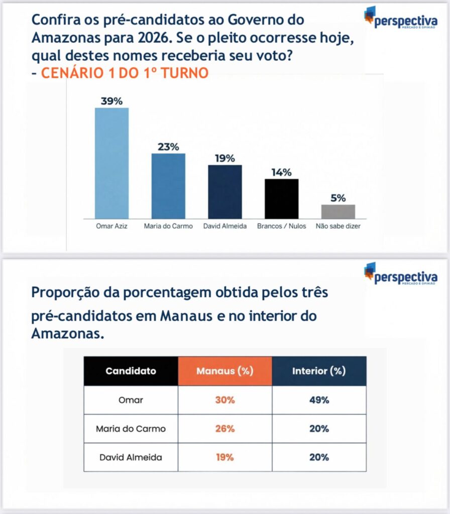 No levantamento realizado com 2.500 entrevistados, entre os dias 17 e 26 de dezembro, por telefone, em todo o Amazonas, a Professora Maria do Carmo se mantém em segundo lugar, a exemplo de pesquisas anteriores, o que indica sua participação no segundo turno das Eleições 2026. Maria aparece em amplo crescimento com 23% das intenções de voto. O senador Omar Aziz (PSD) surge com 39%, enquanto David Almeida tem 19%.