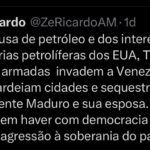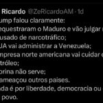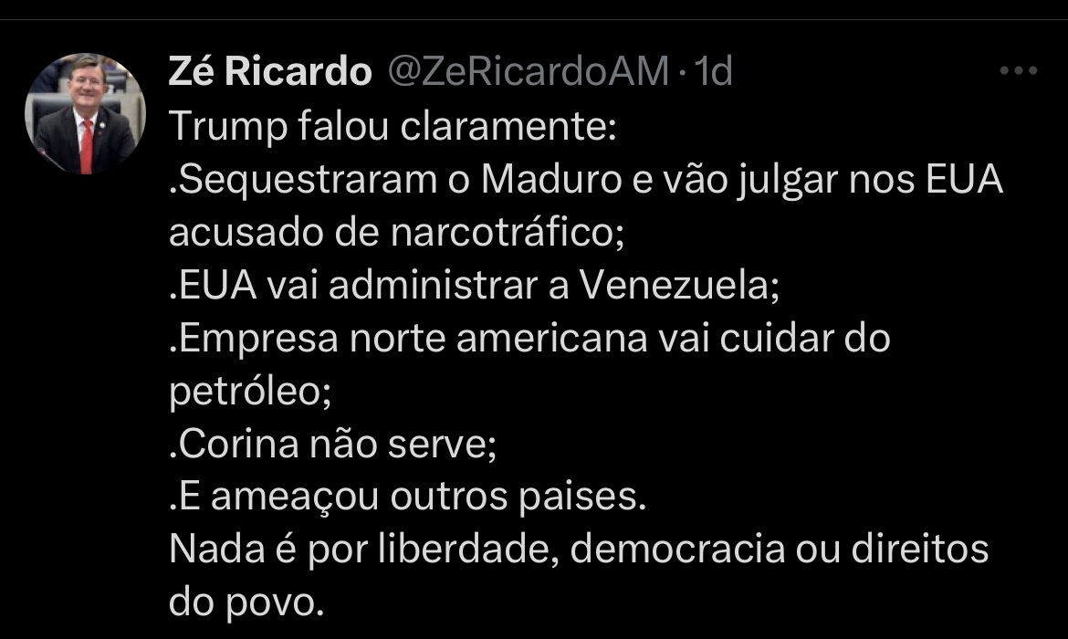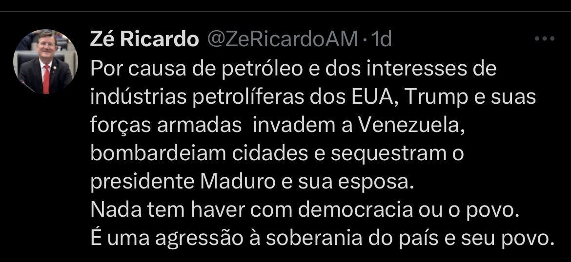 O vereador de Manaus Zé Ricardo (PT) afirmou, em publicação na rede X (antigo Twitter), que a motivação da ação norte-americana estaria ligada aos interesses de empresas petrolíferas dos Estados Unidos.