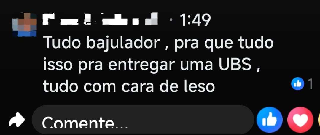 Outro seguidor disse que os comentários positivos na postagem estavam sendo por “bajuladores” e que não precisava de um evento para entregar uma UBS. Já outro cobrou sobre quando ia ser entregue a Cidade dos Autistas. Um quarto disse: “Muitos puxa aff” (sic).