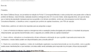 O Convergente entrou em contato com a assessoria da Prefeitura de Manaus, por meio de envio de demanda em e-mail, questionando a afirmação do prefeito de Manaus, David Almeida, em que diz que a maioria da população manauara aprova a gestão e quais dados pode ser baseado a afirmação, mas não obteve respostas até o horário solicitado, sobre as seguintes indagações: