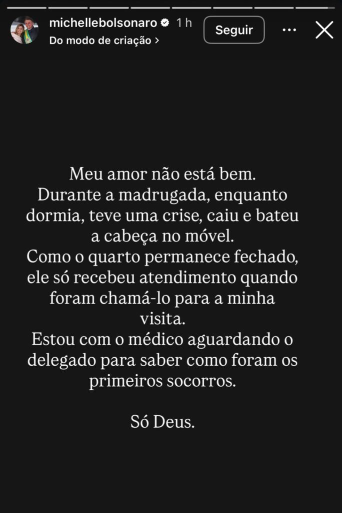 Em postagem nas redes sociais, Michelle relatou que a queda teria ocorrido após uma “crise”, enquanto Bolsonaro dormia. Segundo ela, o ex-presidente só recebeu atendimento médico quando foi chamado para a visita da esposa, por volta das 9h.