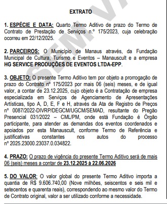 Esta é a quarta vez que a Manauscult prorroga o contrato com a empresa HG Service Produções de Eventos Ltda. – EPP, que continuará a receber recursos milionários dos cofres públicos para a prestação dos serviços por mais seis meses.