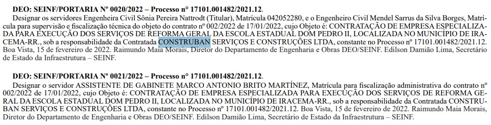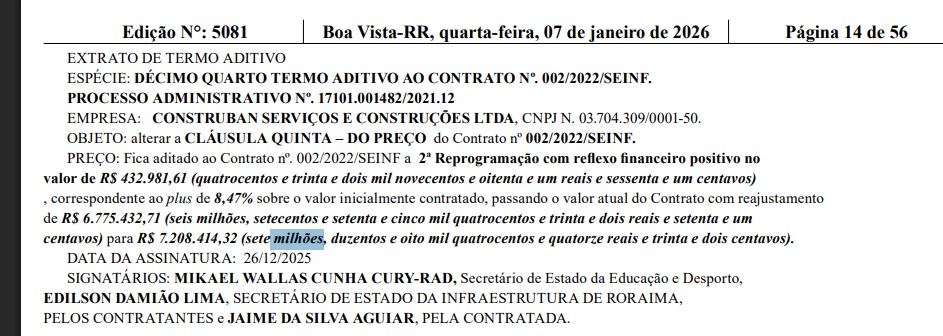 Ainda segundo a publicação no Diário Oficial de Roraima, o reajuste se deu pelo “a “2ª Reprogramação com reflexo financeiro positivo”, assinados pelos signatários: Mikael Wallas Cunha Cury-Rad, secretário de Estado da Educação e Desporto, Edilson Damião Lima, secretário de Estado da Infraestrutura de Roraima, pelos contratantes e Jaime da Silva Aguiar, pela Contratada.