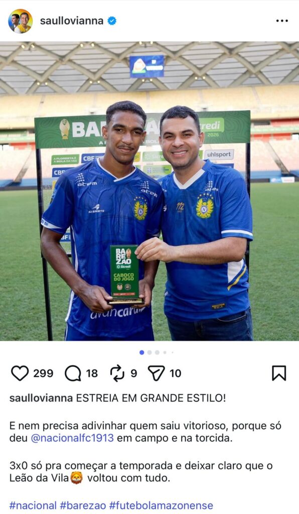 “Estreia em grande estilo. E nem precisa adivinhar quem saiu vitorioso, porque só deu @nacionalfc1913 em campo e na torcida. 3×0 só pra começar a temporada e deixar claro que o Leão da Vila voltou com tudo”, escreveu, ao compartilhar fotos ao lado dos jogadores.