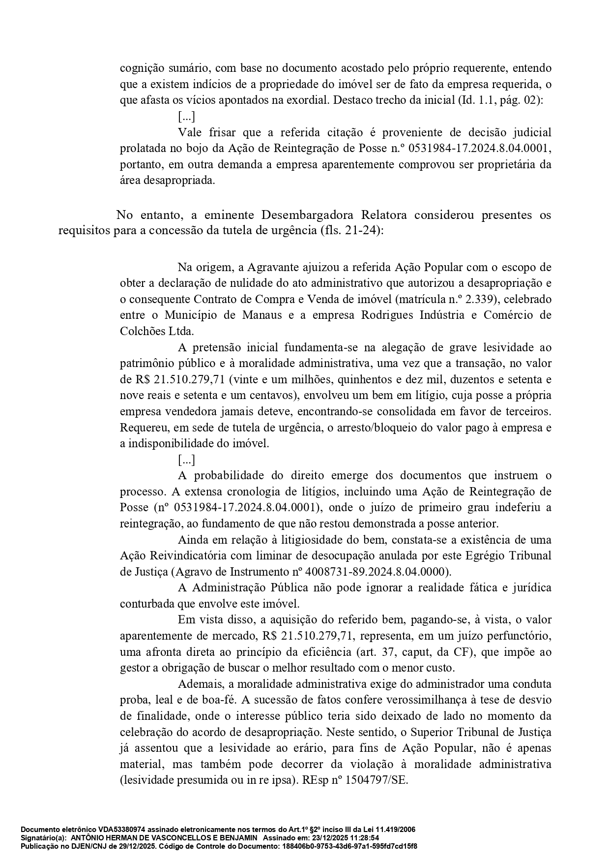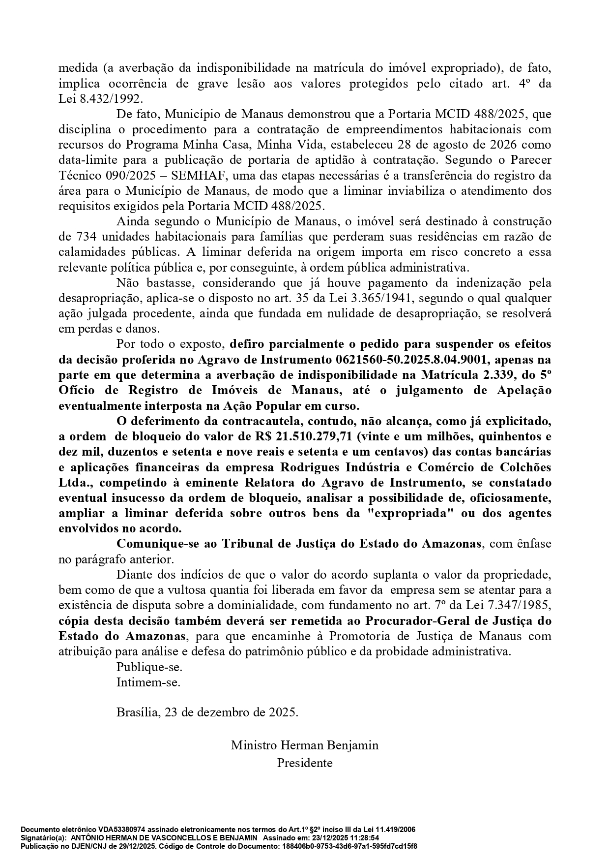 O Superior Tribunal de Justiça (STJ), por meio do presidente, ministro Herman Benjamin, manteve em decisão, o bloqueio de mais de R$ 21 milhões referente a pagamento feito pela Prefeitura de Manaus, na gestão do prefeito David Almeida (Avante) à empresa Rodrigues Indústria e Comércio de Colchões Ltda, pela desapropriação de um terreno na zona Norte de Manaus destinado à construção de 734 moradias populares do programa Minha Casa, Minha Vida.