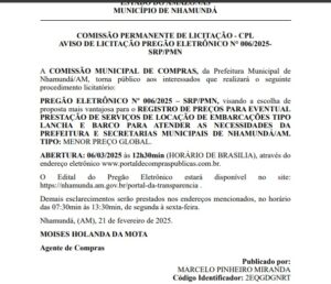 Apenas o Pregão Eletrônico Nº. 006/2025 foi localizado com a contratação de embarcações.