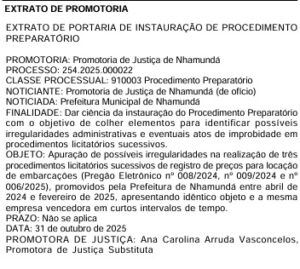 “Apuração de possíveis irregularidades na realização de três procedimentos licitatórios sucessivos de registro de preços para locação de embarcações (Pregão Eletrônico nº 008/2024, nº 009/2024 e nº 006/2025), promovidos pela Prefeitura de Nhamundá entre abril de 2024 e fevereiro de 2025, apresentando idêntico objeto e a mesma empresa vencedora em curtos intervalos de tempo”, diz trecho da instauração do procedimento.