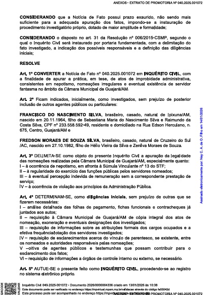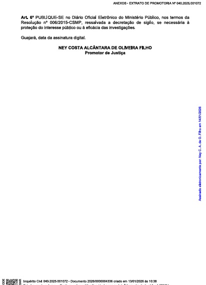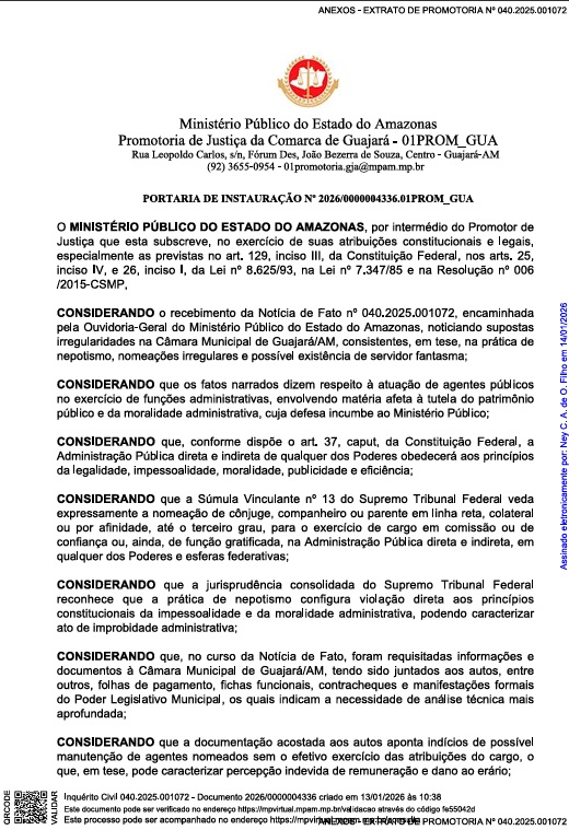 A portaria que instaurou o procedimento é assinada pelo promotor de Justiça da Comarca de Guajará, Ney Costa Alcântara de Oliveira Filho, e foi publicada no Diário Oficial do MPAM no dia 20 de janeiro.