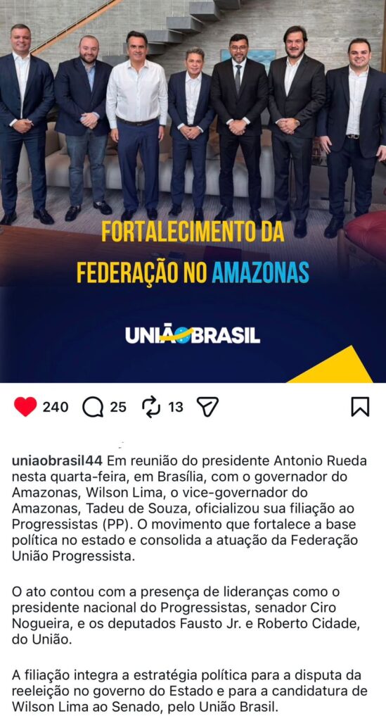 “Em reunião do presidente Antonio Rueda nesta quarta-feira, em Brasília, com o governador do Amazonas, Wilson Lima, o vice-governador do Amazonas, Tadeu de Souza, oficializou sua filiação ao Progressistas (PP). O movimento fortalece a base política no estado e consolida a atuação da Federação União Progressista”, diz trecho da publicação anunciando Tadeu de Souza na legenda.