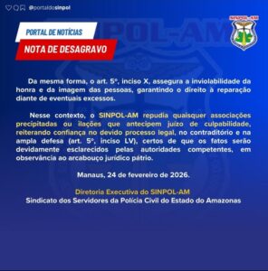 O Sindicato dos Servidores da Polícia Civil do Estado do Amazonas (Sinpol-AM) tornou pública uma nota de desagravo em apoio à investigadora Anabela Cardoso de Freitas, após a repercussão da Operação Erga Omnes e a veiculação de conteúdos que mencionam o nome da servidora.