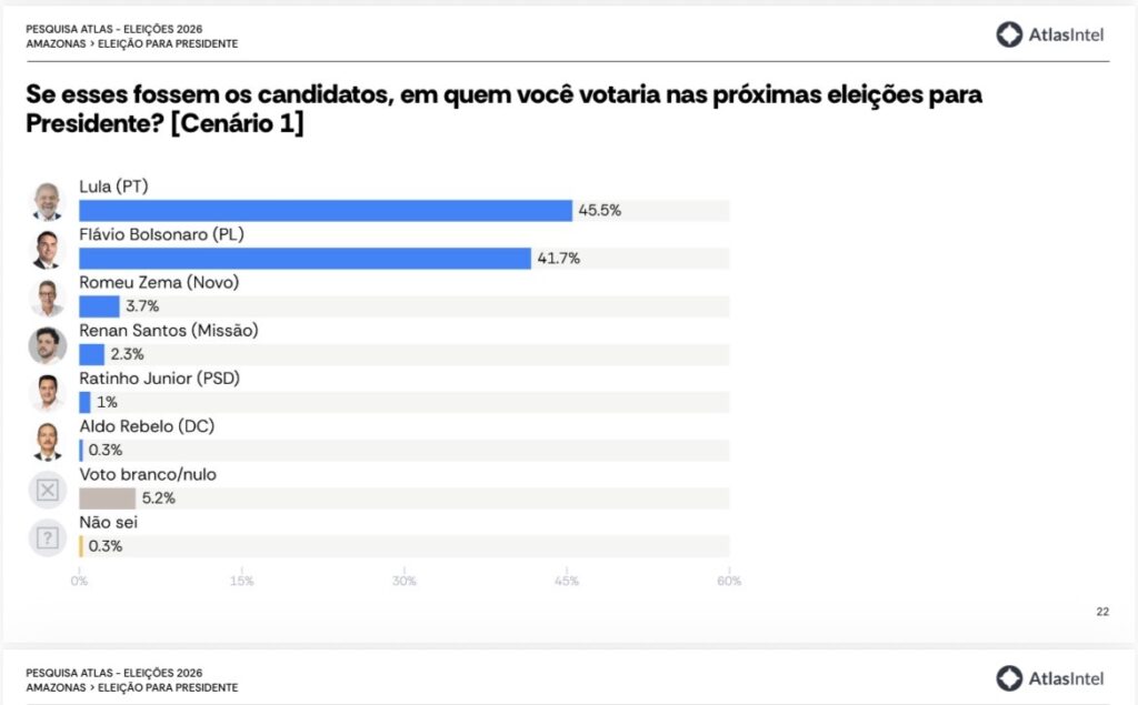 No mesmo levantamento, o instituto AtlasIntel também testou cenários para a disputa presidencial. Os dados indicam empate técnico entre o presidente Luiz Inácio Lula da Silva e o senador Flávio Bolsonaro (PL-RJ) tanto em simulações de primeiro quanto de segundo turno para o Palácio do Planalto.