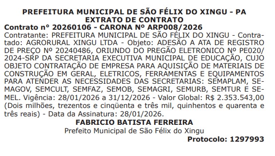Um extrato de contrato publicado pela Prefeitura de São Félix do Xingu, município do Pará, acende alerta sobre o uso do mecanismo de “carona” em atas de registro de preços para aquisição de materiais diversos. O extrato foi publicado no Diário Oficial do Estado.
